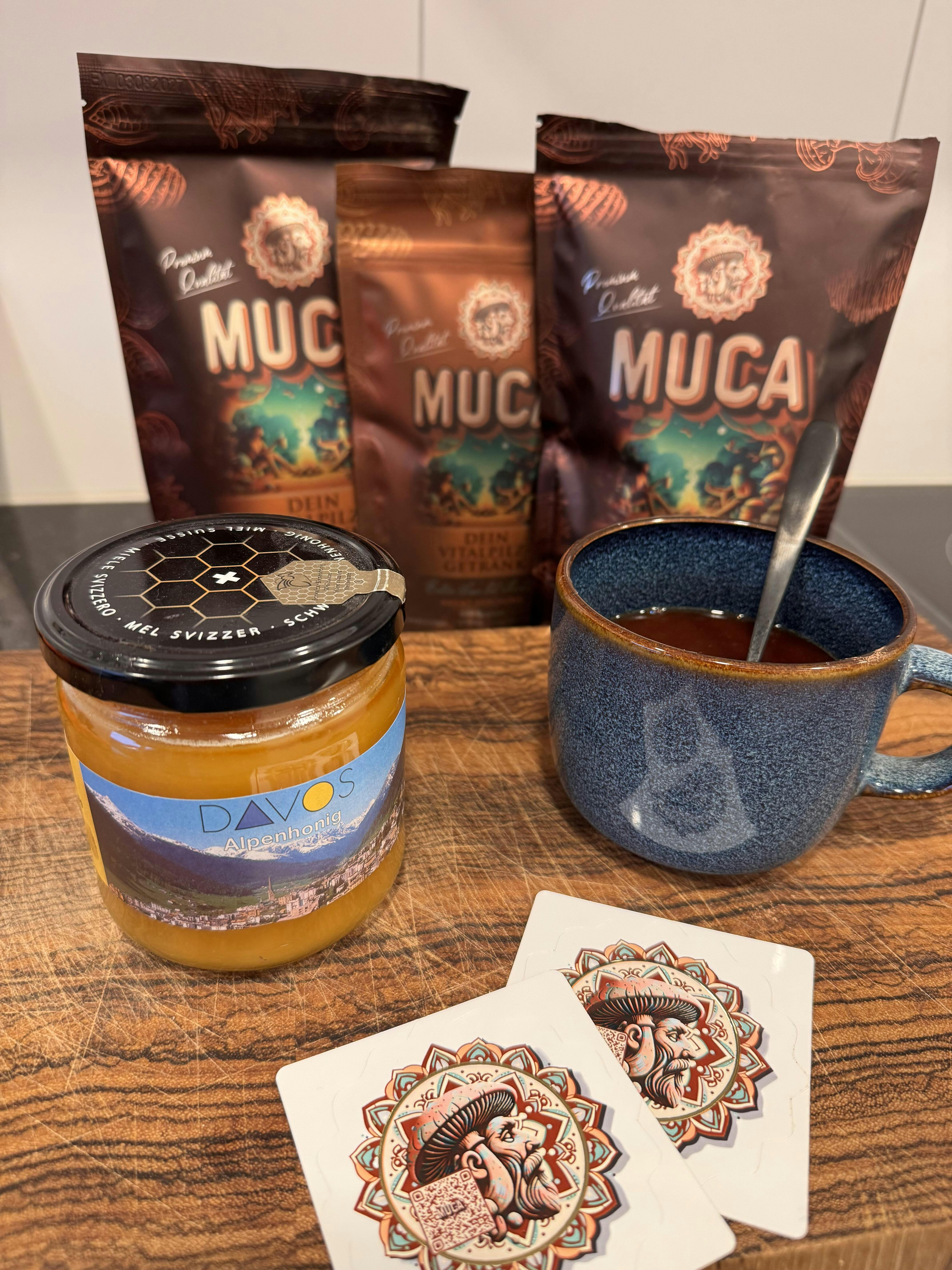 Erlebe mit MUCA einen sanften, aber kraftvollen Energie-Boost – ohne Zittern, ohne Hochs & Tiefs. Einfach Wasser, MUCA-Pulver, (optional) ein Süssungsmittel & Deine Lieblingsmilch mischen – fertig ist Dein neues Morgenritual.